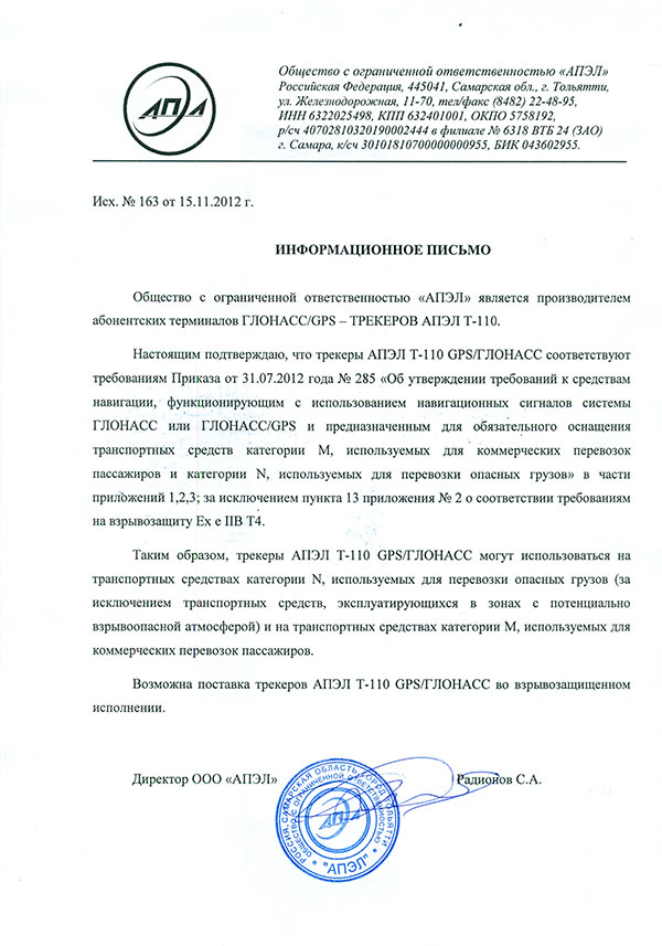 Устройство может быть адаптировано в уже существующие системы мониторинга транспорта и легко настроено для обмена важной информацией с серверами или напрямую с пользователями. Внедряя систему мониторинга на базе трекера АПЭЛ Т-110 GPS, пользователи обеспечивают контроль транспорта, предотвращают хищение ГСМ, выявляют случаи нецелевого использования техники, предупреждают ее поломки и значительно повышают эффективность работы транспортных подразделений.